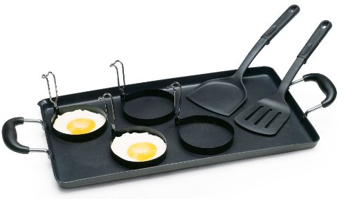 18-inch by 10-inch double burner griddle made of aluminum with nonstick coating, double handle for comfort handling, and stay cool when cooking, include 2pc tools and 4 egg rings